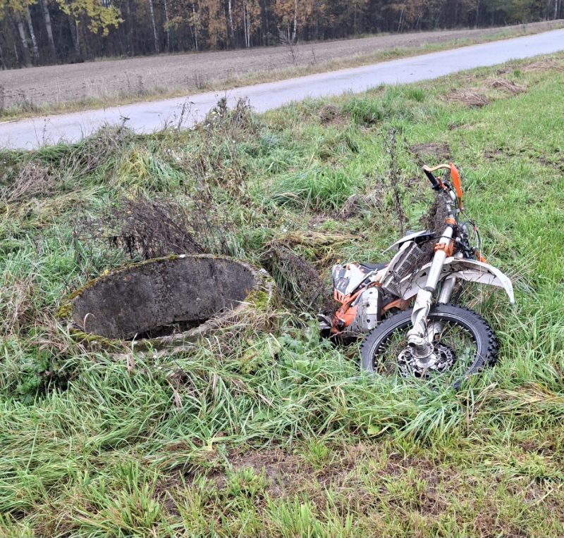 Kolizja młodego mężczyzny jadącego motocyklem krosowym ze studnią melioracyjną przy drodze Lipowo-Płociczno.